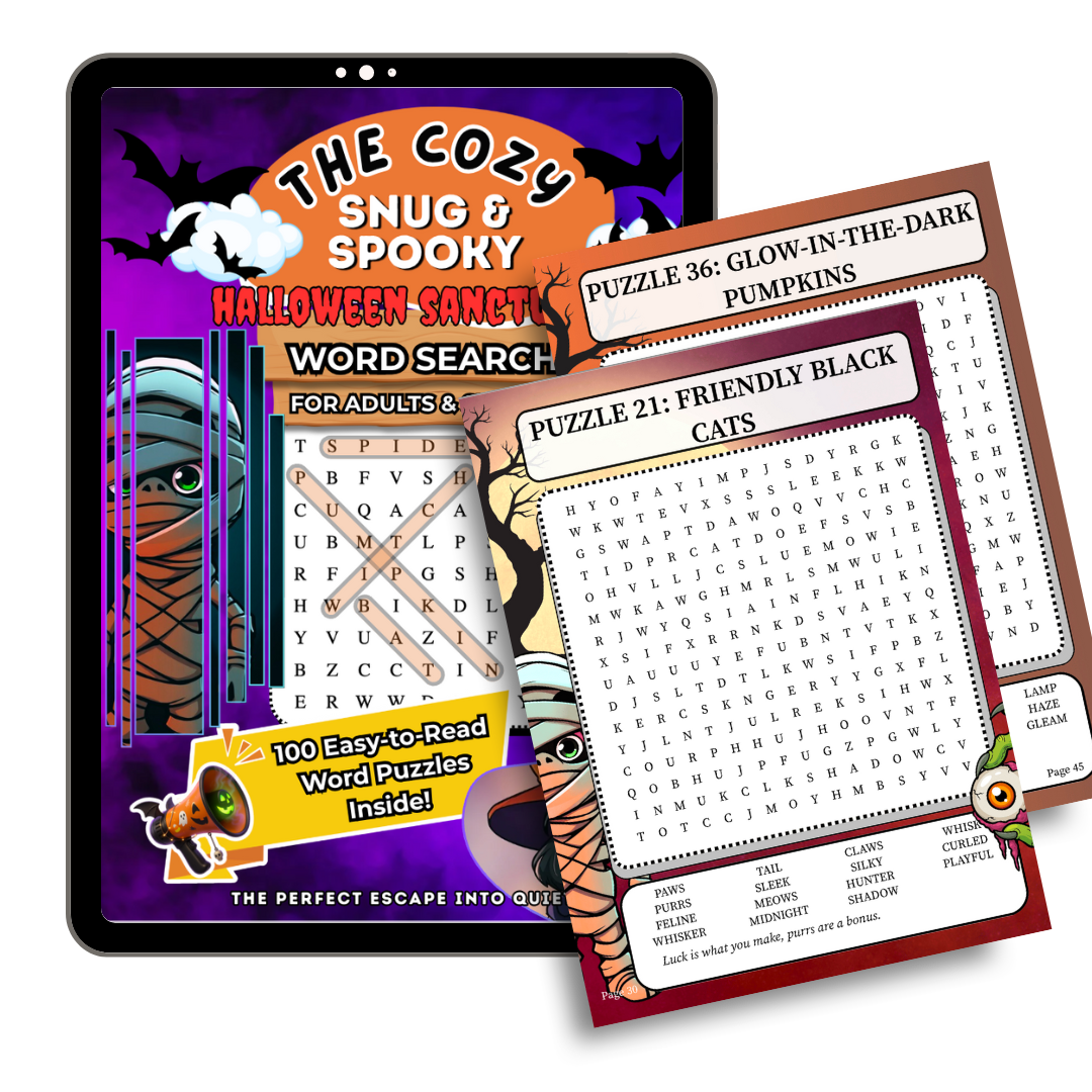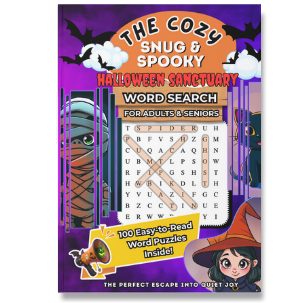 Step inside the Cozy, Snug & Spooky Halloween Sanctuary — the word search collection that makes fall nights fun, festive, and just a little eerie.